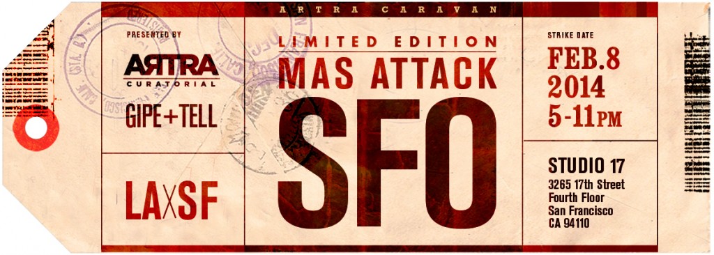 Opening tonight, February 8th at Studio 17, San Francisco is “MAS (Ltd Ed) >> San Francisco” a one-night-only exhibition which is aimed at providing artists with a sense of community, contacts and networking, as well as a chance to meet new faces, catch up with old friends and to be seen. Organized by Artra Curatorial, this exhibition is constructed as a kind of relational-aesthetics type of participatory engagement, as the focus is upon the interactions of the participants (we do not select the artworks for these, only the artists to invite, who decide what they want to bring) rather than the actual art works displayed.